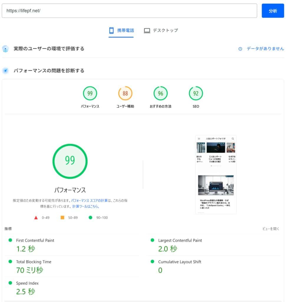 この最後の施策の結果、PageSpeed Insightsのスコアは99点を記録しました。プラグインの選定から始まった長い最適化のプロセスは、最終的に「何を捨てるか」というコンテンツ戦略上の決断によって、ようやく終着点を迎えたのです。