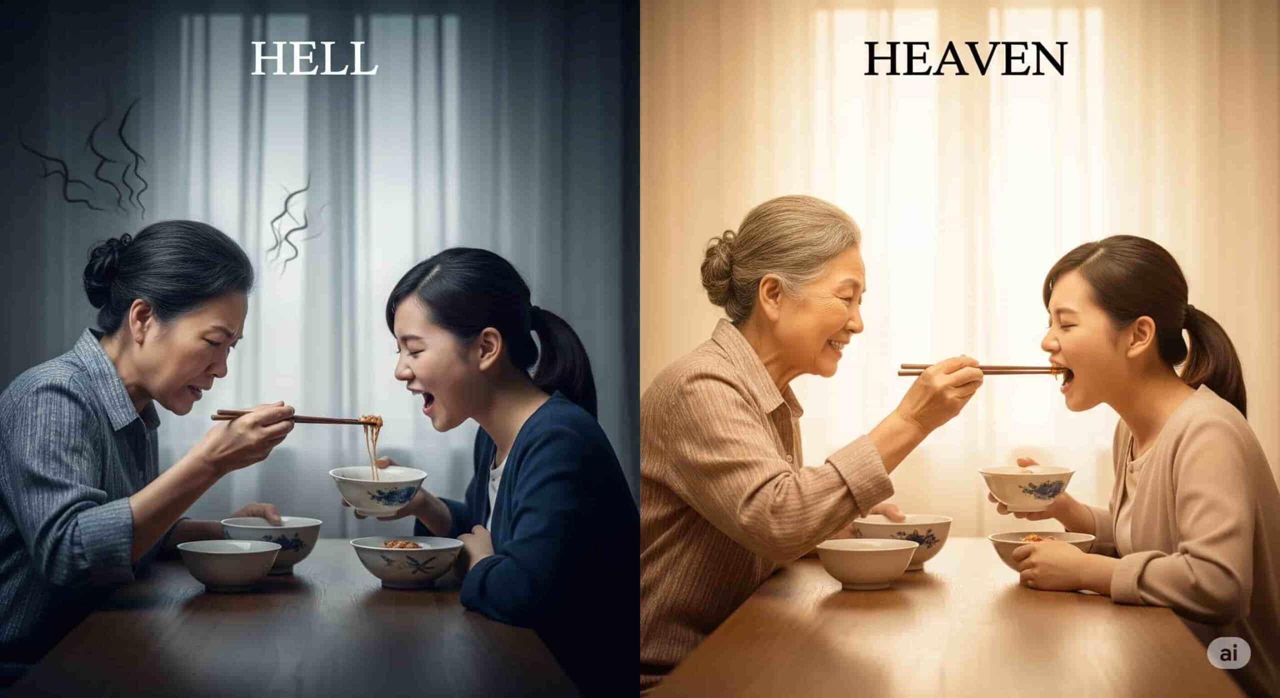寓話「三尺三寸箸」には、地獄と極楽の情景が描かれています。どちらの世界も、豪華な食事が並び、約1メートルもある長い箸を使うという条件は同じです。